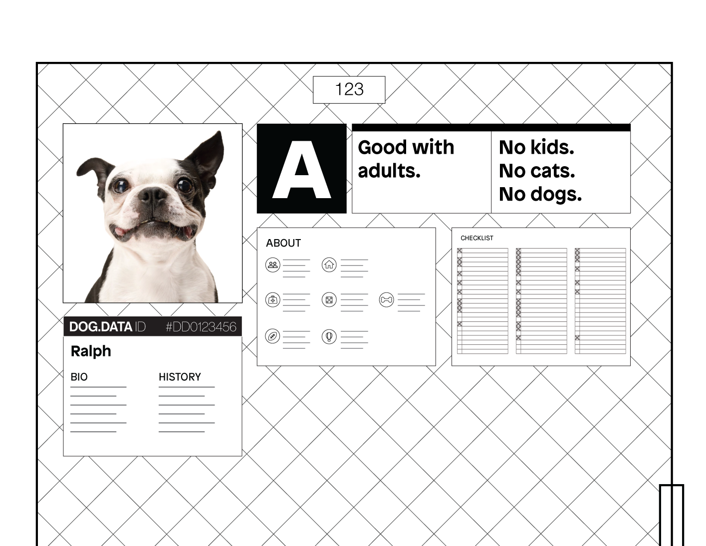 Dog.Data redesigns the service of dog adoptions in the US. The services and interactions are not only made to suit the user’s needs and desires in the process, but also nudges the adopters to choose the right dog for them, and not choose based off of traditional criteria, like breed or age. Dog.Data creates more successful dog adoptions for happier owners and emptier shelters.