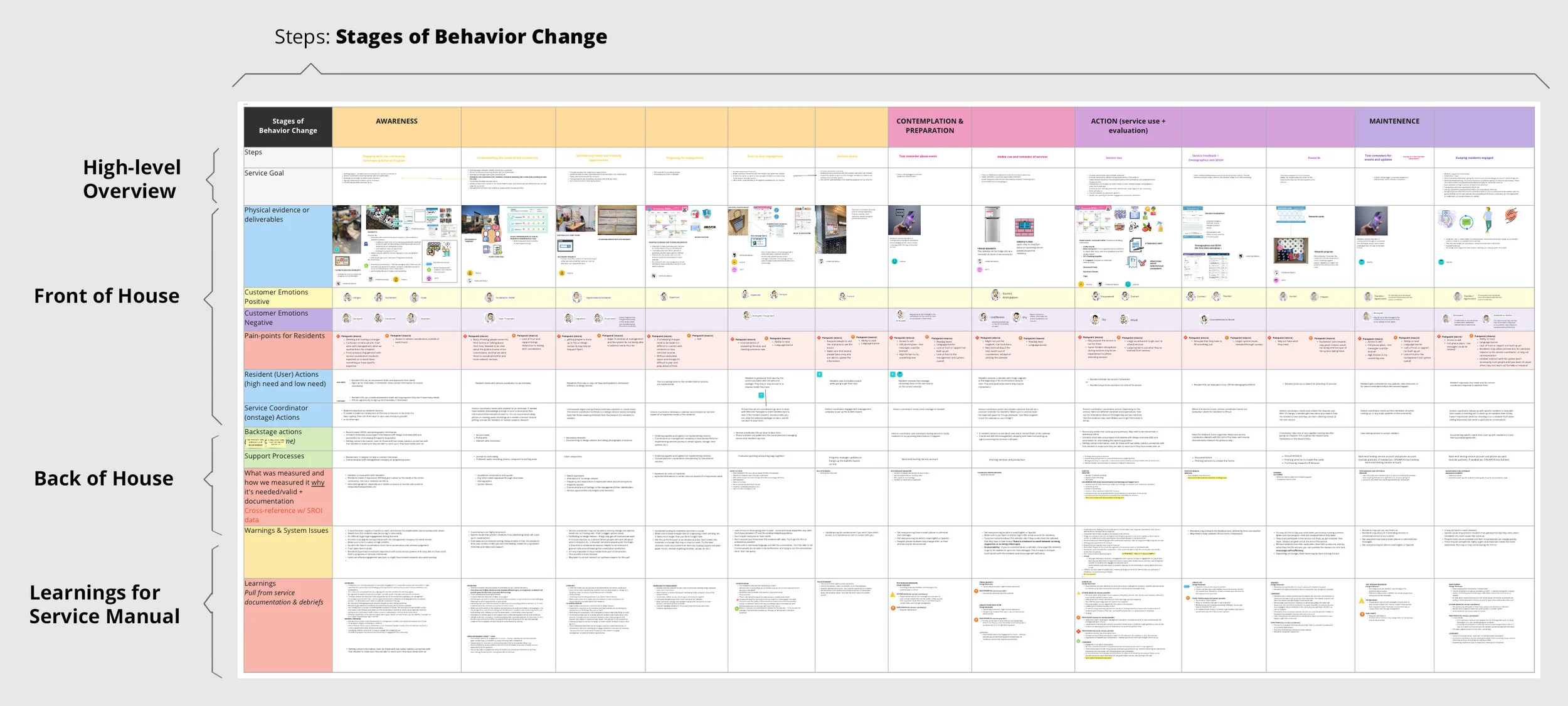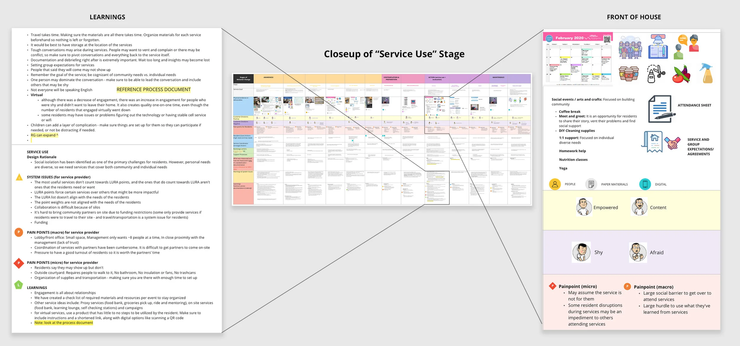 Our blueprint is more complex than a typical service blueprint. This is because we plan on creating a service manual based off of what we have learned, so that other people that want to create a model like ours can do so through our Service Manual, which is on pause because of COVID. What we do have is our service blueprint, with a few layers added in: nudging for behavior change, measure & evaluation of Social Return on Investment (SROI), and our learnings/warnings etc. that would be good to know for anyone who wants to replicate this model.