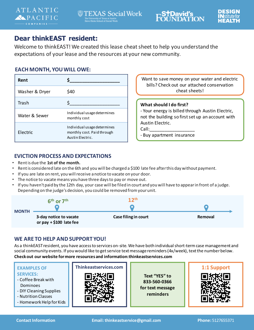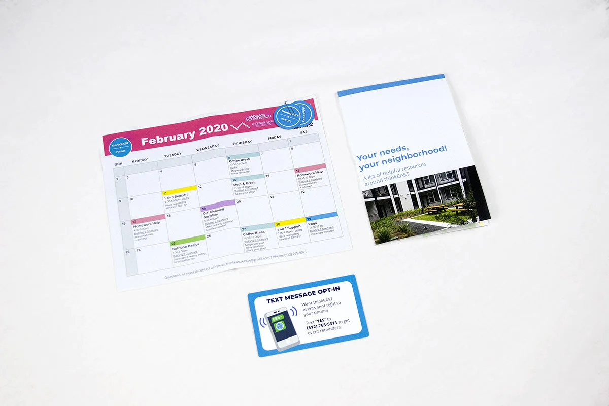 Welcome packages, resident surveys, information sheets, website (ex: updating residents on their rights surrounding eviction), calendars, etc.